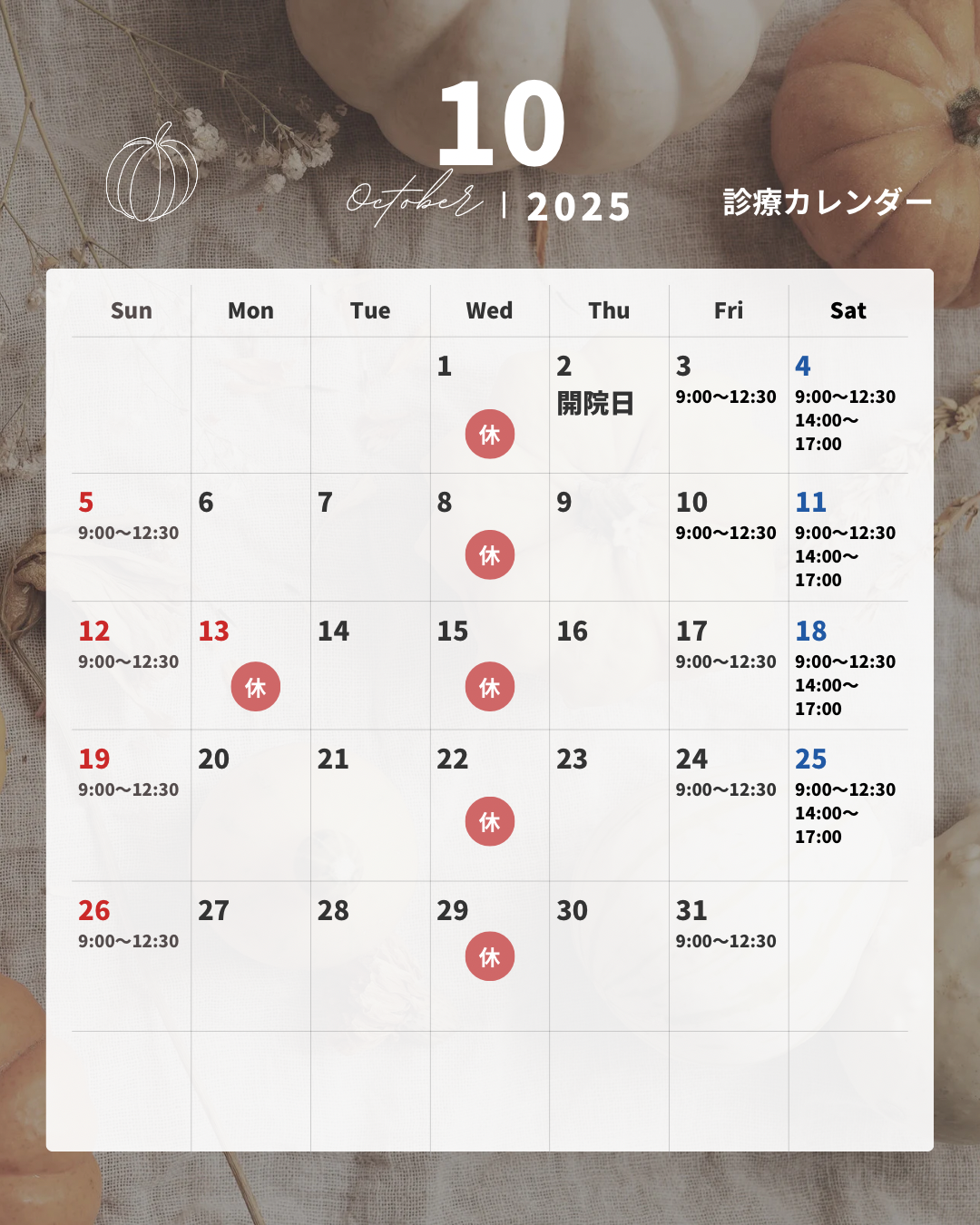 10月の診療スケジュールは、下記の診療カレンダーにてご案内しております。